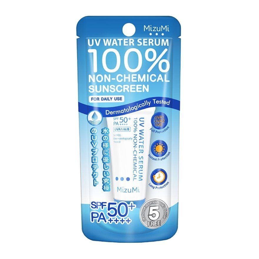 Mizumi UV Water Serum SPF50+/PA++++Water based sunscreen for sensitive skin. Blue tube for daily use. 100 free of chemical sunscreens using the principle of irradiation. UVA1/UVA2/UVB which is the cause of dullness and premature aging from the skin light texture. Does not leave stains after setting Can be used by everyone in the family. Free from oils, fragrances, parabens, alcohol and synthetic colors.