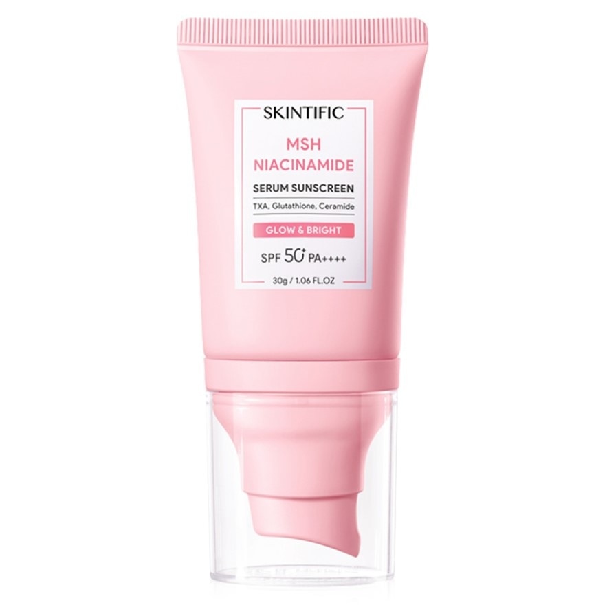 SKINTIFIC Niacinamide Serum Sunscreen SPF50+ PA++++ Included sunscreen Triple Brightening technology with MSH Niacinamide, Tranexamic Acid and Glutathione that brightens the skin and acts as a shield for the skin, and Parsol-UV Mix technology provides 360 protection from UVA, UVB and blue light.