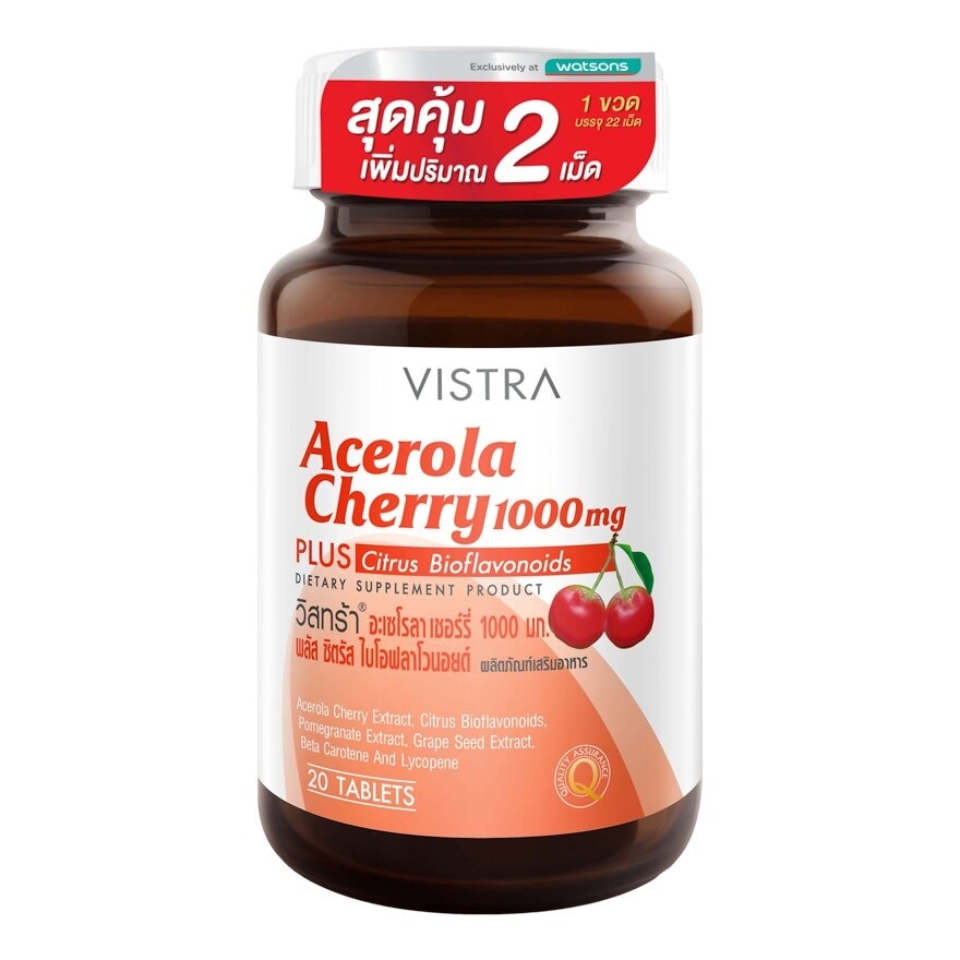 Vistra Acerola Cherry 20Tab+2Tab Cautions: Allergy information : contains soy products Children and pregnant woman should not eat. Always read the label warning before use. No effect on prevention or treatment of diseases. Should routinely eat appropriate proportion of varieties of 5 food groups.